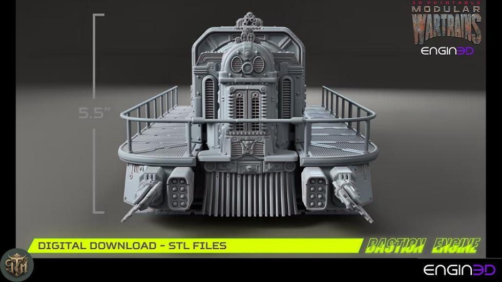 Bring brutal, post-apocalyptic firepower to your tabletop with the Bastion Engine! This stunning model features a heavily armored train car with armor plating, reinforced wheels, and intricate mechanical detailing—perfect for any wasteland, dieselpunk, grimdark, or any other tabletop adventure.