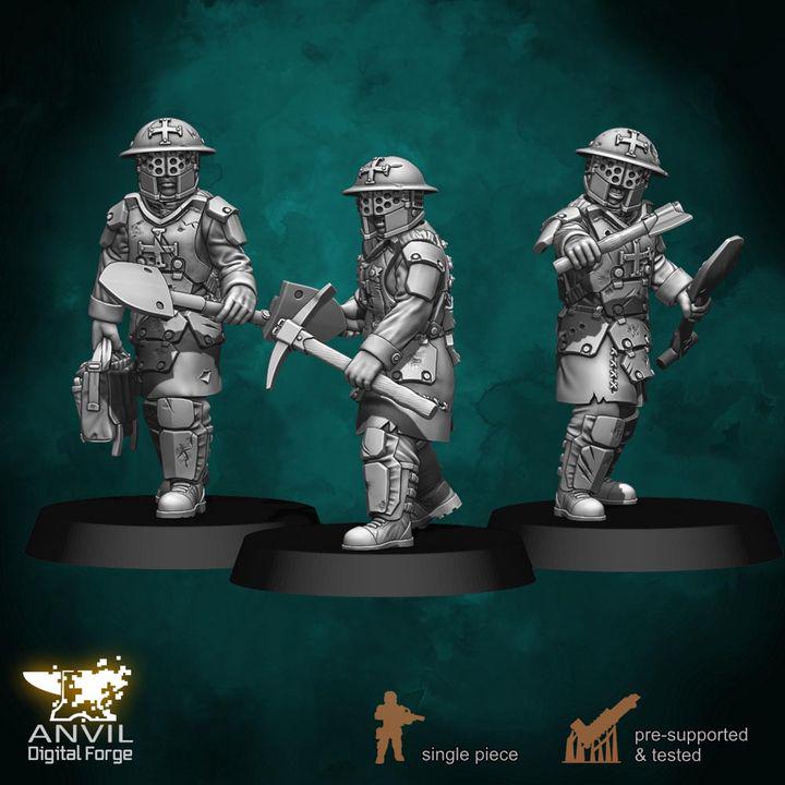 - 3 Male figures in very heavy Pioneer armor with entrenching tools, pioneer axes and pickaxes, and 2 satchel charges.